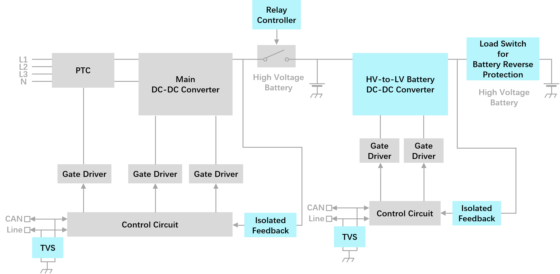 µçÍøÖеĽ»Á÷µçͨ¹ý½»Á÷³äµç×®Ö±½Ó¸ø³µÔسäµçÆ÷ (OBC) ¹©µç£¬OBC °Ñ AC ת»»³É DC£¬È»ºóͨ¹ýÅäµçÏäΪ³µÄڵ͝Á¦µç³Ø³äµç¡£Ö±Á÷³äµç×®Ôò°üÀ¨Ðí¶à AC-DC µçÔ´Ä£¿é¡£´ÓÏÖÔÚ³äµç×®Êг¡µÄ״̬À´¿´£¬ÓÐ 3 ´óÇ÷ÊÆ£º¿í¹æÄ£µÄºã¶¨¹¦ÂÊ¡¢¿í¹æÄ£µÄÊä³öµçѹ¡¢¸ü¸ß¹¦ÂʵÄÄ£¿é¡£ Á½¸öÖ÷Òª¹¦Âʼ¶¡£Ê×ÏÈ£¬¹¦ÂÊÒòËØÐ£Õý (PFC) ¼¶£¬¼á³ÖÊäÈëµçÁ÷ºÍµçѹ֮¼äµÄÏàλ¹ØÏµ£¬×î´óÏ޶ȵØïÔÌÏß·/µçÍøµçÁ÷µÄ×Üг²¨Ê§Õæ (THD) ¡£ÕâÓÐÖúÓÚïÔÌÈÎºÎÆÌÕŵÄÎÞ¹¦¹¦ÂÊ£¬Ìá¸ßÕûÌåÄÜЧ¡£ µÚ¶þ¹¦Âʼ¶ÊÇ DC-DC ת»»Æ÷£¬Ëü´Ó PFC ¼¶»ñµÃ DC Êä³ö£¬²¢½«Æäת»»Îªµç³Ø³äµçËùÐèµÄµçƽ¡£×ª»»Æ÷µÄÊä³öµçѹºÍµçÁ÷»ùÓÚµç³ØµÄÕûÌ念½¡×´Ì¬ºÍ³äµç×´Ì¬ËæÊ±¼äת±ä¡£ ÆñÂÛÊǹ¦ÂÊÒòÊýУÕý£¨PFC£©¡¢Ô±ß²à DC-DC¡¢»ò¶þ´ÎÕûÁ÷£¬×ðÁú¹Ù·½Æ½Ì¨¶¼¾ßÓÐÏìÓ¦µÄ½â¾ö¼Æ»®£¬Æû³µÏµÁвúÆ·º¸Ç¶þ¼«¹Ü¡¢MOSFET¡¢TVS µÈÖݪֲúÆ·¡£ºÃ±È£ºÕûÁ÷£«LLC ×é³ÉÁ˳äµç×®µÄ»ù±¾µç·£¬¿É½ÓÄÉ FRED£¨¿ì»Ö¸´¶þ¼«¹Ü£©¼Æ»®£»CAN ͨѶ¿ÚµÄ ESD ±£»¤¡£