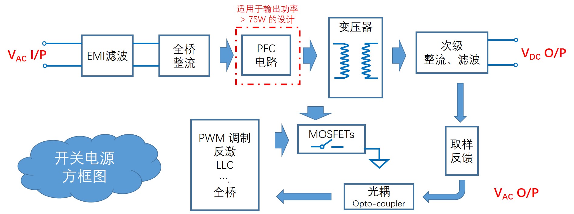 ¿ª¹ØµçÔ´Ö÷ÒªÓÉ·ÀÀËÓ¿µç·¡¢µç´Å×ÌÈÅÂ˲¨µç·£¨EMI£©¡¢³õ¼¶ÕûÁ÷Â˲¨µç·¡¢¹¦ÂÊÒòÊýУÕýµç·£¨PFC£©¡¢PWM ¿ØÖƵç·¡¢¹¦ÂÊת»»µç·¡¢Êä³öÕûÁ÷Â˲¨µç·¡¢È¡Ñù·´Ïìµç·ºÍ±£»¤µç·µÈ×é³É¡£