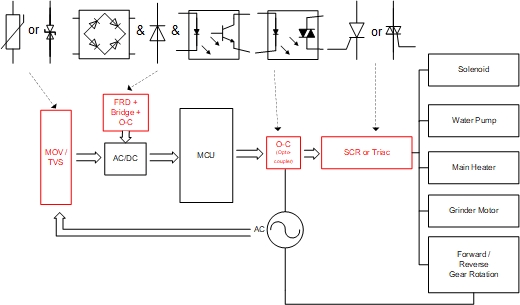 ÈËÃǰѵç×ÓÊÖÒÕÓ¦Óõ½¿§·È»úÉÏ£¬ÊµÏÖÁËÄ¥·Û¡¢Ñ¹·Û¡¢×°·Û¡¢³åÅÝ¡¢É¨³ý²ÐÔüµÈÄðÖÆ¿§·ÈÈ«Àú³ÌµÄ×Ô¶¯¿ØÖÆ£¬´´Á¢ÁËÈ«×Ô¶¯µç×Ó¿§·È»ú¡£ Ó¦ÓÃÓÚÏûºÄµç×ÓÁìÓò£¬×ðÁú¹Ù·½Æ½Ì¨ ÄÜÌṩ½ÏÁ¿ÆëÈ«µÄÔª¼þ½â¾ö¼Æ»®¡£ºÃ±È£ºAC ÊäÈë¶Ë·ÀÀËÓ¿µÄѹÃôµç×裨MOV£©¡¢µçÔ´²¿·ÖÓÿì»Ö¸´¶þ¼«¹Ü£¨FRD, fast recovery diode£©¼°ÕûÁ÷ÇÅ£¨Bridge£©¡¢¹âµç¸ôÀëÆ÷¼þ£¨Opto-coupler£©¡¢¿ØÖƸºÔØÍ¨¶ÏµÄ¿É¿Ø¹è£¨SCR & Triac£©µÈ¡£